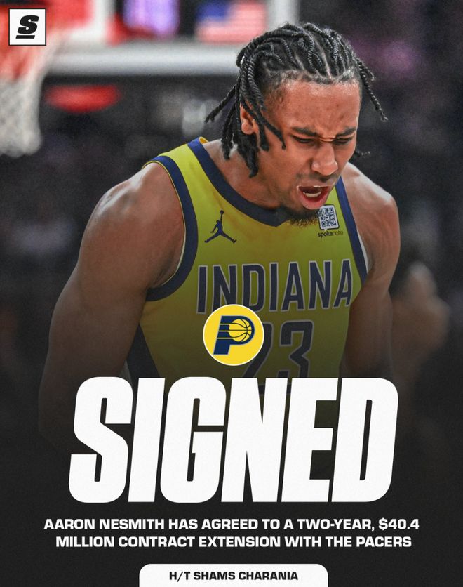 北京时间10月21日,据ESPN报道,印第安纳步行者队与内史密斯达成提前续约协议。合同两年价值4040万,平均工资只有2020万。 26岁的内史密斯上赛季表现出色。他季后赛的三分命中率高达49.2%。这是季后赛出手至少100+三分球的NBA球员中最高的命中率。 NBA记者埃文·斯蒂利也贴出了一张内史密斯手臂肌肉肿胀的照片,向步行者队表示祝贺。内史密斯不仅一年比一年进步,今年夏天他还将把自己训练成恶魔般的肌肉男,新赛季他的对抗能力将再次提升。内史密斯上赛季常规赛场均出战25分钟,得到12分4篮板1.2助攻0.78抢断0.38盖帽。他的投篮命中率为50.7%,三分命中率为43.1%,罚球命中率为91.3%。何乔成立了180俱乐部。埃文·斯蒂利还透露了内史密斯的合同细节:25-26赛季1100万,26-27赛季1100万,27-28赛季2020万,28-29赛季2020万。此后四年他的工资只有6240万,平均工资1560万。对于这样的顶级3D,步行者队有麻烦了。 CBS记者Sam Quinn对内史密斯的续约进行了评价:在这份明显低于市场价格的续约合同中,阿隆·内史密斯的身价高于他与步行者队签下的两年4040万美元。不过,根据他现有的合同条款,他能得到的最高加薪是有限的(低于工资帽12%),为了保护自己的利益,他只能接受一定的折扣。鹈鹕队的赫伯特·琼斯也面临着类似的情况。肯尼史密斯说:我真的很感谢内史密斯。他值得这份续约合同。这份续约对于步行者来说非常有效。 27-28赛季的大约2000万甚至还不到该时期上限的12%。