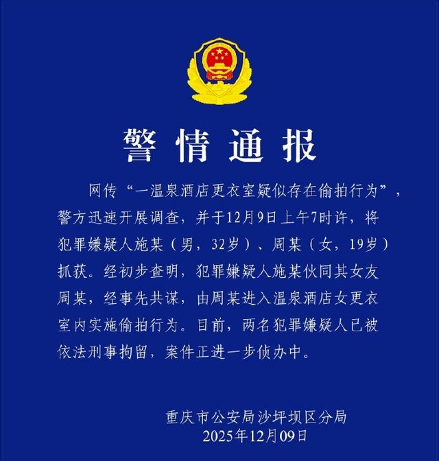 近日,重庆一温泉商卷入偷拍丑闻。有网友晒出一些以不正常角度拍摄的温泉更衣室室内女客人的照片,并表示疑似大量女客人在洗澡时被偷拍。不久后,涉事温泉公司发布声明称,公司已报警并启动最严格的全面内部自查。 12月9日,重庆市公安局沙坪坝分局发布警方信息通报称,经初步侦查,犯罪嫌疑人史某(男,32岁)与其女友周某(女,19岁)事先共谋,闯入温泉酒店女更衣室进行秘密拍摄。目前,两名犯罪嫌疑人已被依法刑事拘留,案件正在审理中正在进一步调查中。 ▲报道截图 9日,红星新闻记者联系上此前发布相关视频的网友周先生。他告诉红星新闻记者,自己是一名专门调查非法候选人照片的从业者。 11月,他无意中在网站上看到上述温泉商的候选人照片,预感到不对劲。 “(他们)肯定是同一伙人,因为他们的作案手法很相似。”周先生表示,根据他的观察,这些偷拍视频的作案手法是,女团伙将便携式摄像设备装在包里,然后带着摄像机到女更衣室录制手机视频。至于他是如何得知候选照片发生在重庆一家温泉商户的,周先生表示,他首先是在一个网站上发现候选照片,并看到视频中的品牌名称,所以他猜到了地点通过大众点评的环境地图和照片得知事件发生地。 “确认后,我先打电话给商家告知,然后选择在网上曝光候选人的编码照片。”我希望它能引起人们的注意。 “据周先生介绍,在重庆春天这门火爆生意的视频中,该人在女更衣室里偷偷拍摄了视频,拍摄温格尔大约持续了20、30天。对他来说,有的人脱光了衣服,有的人只穿了半件衣服,进行巡逻检查,也提醒游客注意。毕竟现在枪杀候选人的情况很严重,必须站出来抗争。”红星新闻记者罗梦洁实习生 李静 编辑 郭宇 评论 任志江